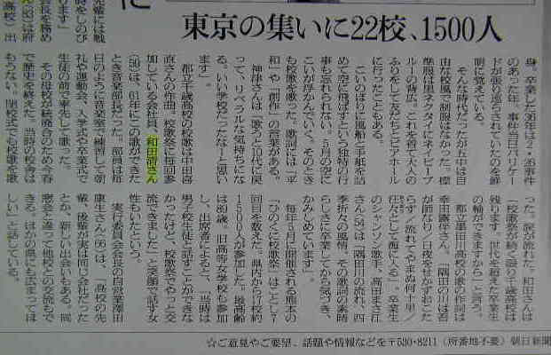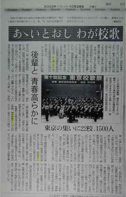 今年は、10月上旬に「第11回東京校歌祭」を星陵会館(日比谷高校の同窓会館、永田町)で開催する予定です。我が「誠之会」も、同窓会会員はもちろんのこと、旧教職員やPTA或いは新設校「芦花高校」など多くの方々に呼びかけ、校歌を通じて旧府立12中・都立千歳高の伝統や建学の精神を伝え継ぐと共に、交流の輪を広げる催しになるよう、今後も参加していきたいと願っています。また今後は、誠之会の財政事情等も考慮し、新しい試みや工夫を入れて継続していきたいと考えています。 追伸:昨年10月28日(月)の朝日新聞夕刊(中高年層向けの「ほがらか」欄)に、東京校歌祭が大きく取り上げられました。取材の日は雨の中、日比谷公園の松本楼に関係者が集まり、インタビューに応じたもので、神津会長・井上実行委員長らと共に、小生の校歌祭や千歳高への思いが記事として掲載されましたので、下記に一部を紹介させていただきます。