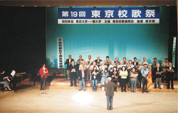 平成23年10月1日(土)午後1時〜5時 於:日比谷公会堂 秋季恒例の「東京校歌祭」は、19年目を迎え、快晴に恵まれた日比谷公会堂で開催されました。参加校は、都立高17校と特別参加の旧制高校2校(東京大学、一橋大学)で、参加者・入場者合わせて約1,700名と今年も大盛況でした。 私達の母校、府立十二中・都立千歳高校は、指揮者・田代氏(19期)、ピアノ伴奏・鈴木さん(19期)のもと、全員で「健児の歌」、「千歳高校校歌」、「学園思慕の歌」を声高らかに歌いました。今年は、芦花高校の来栖先生(22期)など初参加の方や毎年ご参加の本間元校長を含め約30名でした。大先輩から若い同窓生そして男女バランスの取れた出場者で、リズムよく爽やかに歌うことが出来ました。受付の武藤さん(19期)や会場係の甘利氏(33期)はじめ皆様のご協力をいただきました。終演後の懇親会も、大勢の方々が参加し、ニュートーキョー有楽町店・ビアレストランで話の尽きない楽しい親睦のひと時を過ごしました。 今回、初参加者には校歌等のCDを配布し、また当日の写真も後日全員に送付しました。 来年は、いよいよ「第20回記念大会」を迎えます。大イベントが企画されていますので、千歳高・誠之会しても参加者を大幅に増員したいと思います。「東京校歌祭」は、誠之会にとっても総会に次ぐ正式行事ですので、来年は、皆様お誘いのうえ是非ご参加ください。これからも校歌・学園歌を通じて“誠之”の心を守り続けたいと願っています。 <参加者> 敬称略 1期-小野、5期-宮地、6期-山田、米田、9期-小田、斎藤 11期-茂泉、田嶋、浅見、12期-佐野、人見、13期-磯部、佐伯、14期-大河原 15期-吉本、藤元、17期-八木、萩原、18期-岡田、山本、和田、19期-鈴木、田代、武藤 22期-来栖、23期-儘田、24期-池田、26期-市川、玉田 30期-丸山、33期-甘利、39期-小松 本間元校長 来年の「第20回記念大会」は、平成24年10月6日(土)です。 今後とも「東京校歌祭」へのご理解とご協力そしてご参加をお願いします! 報告者:常任幹事・校歌祭担当 和田清(18期) ![]() ![]() ![]() <本番前練習風景> |